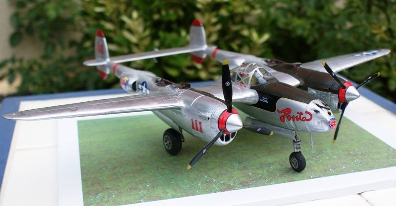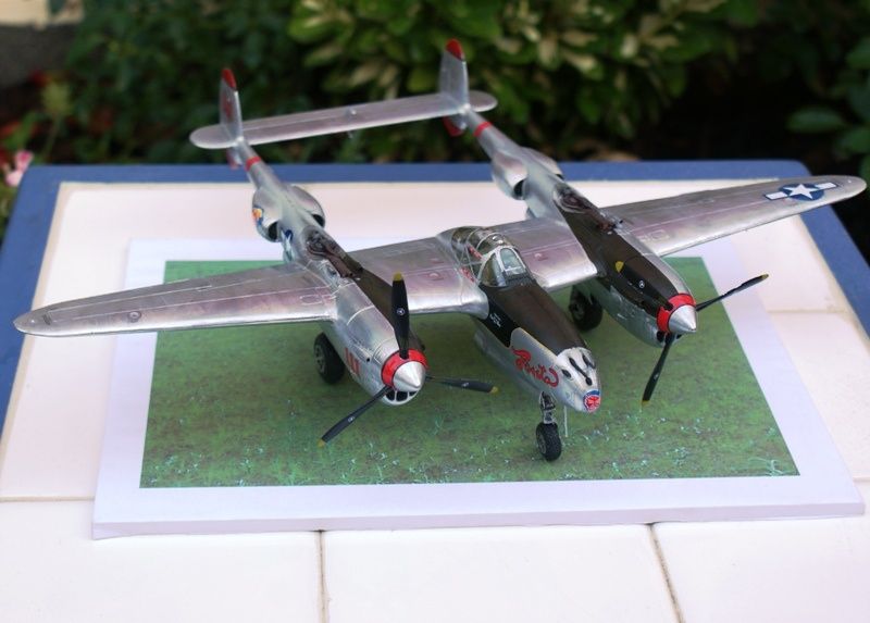 pour ma part, j'ai opté pour les roues résine et j'ai choisi (après une longue réflexion...) le profil du "box art", à savoir, le P-38 L piloté par le Cpt Ken HART , 431° fighter squadron, 475 ° fighter group , philippines, juin 1945. j'ai traité l'alu au rub n'buff et j'ai eu quelques problèmes avec, ce qui me laisse malheureusement quelques regrets quand au résultat.
